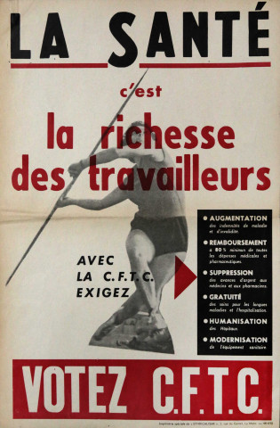 [une photographie d'un athlète lançant un javelot. Texte rouge et noir sur fond écru] / [non identifié]. - Paris : CFTC, [1962] (Le Mans : Imprimerie spéciale de "Syndicalisme", 5 rue du Cornet). - 1 affiche couleur. Date d'après l'annotation manuscrite au crayon à papier au verso.