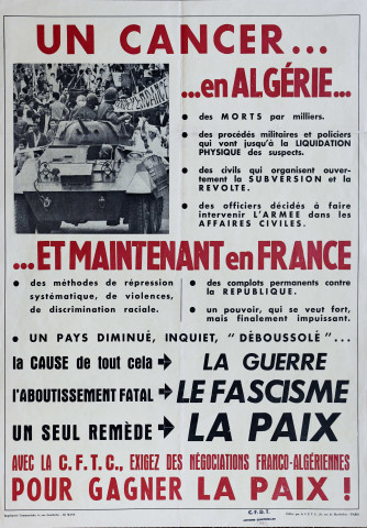 [vignette photographique d'un char de l'armée française au milieu d'une foule d'algériens brandissant des drapeaux algériens et une banderole "indépendance". Texte rouge et noir sur fond écru] / [non identifié]. - Paris : CFTC, [octobre-novembre 1961] (Le Mans : Imprimerie Commerciale, 6 rue Gambetta). - 1 affiche couleur. Date d'après la proximité supposée avec le massacre du 17 octobre 1961 à Paris.