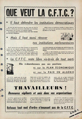 [aucune illustration, texte noir sur fond écru] / [non identifié]. - Paris : CFTC, mai 1958 (s.l. : s.n.). - 1 affiche texte.
