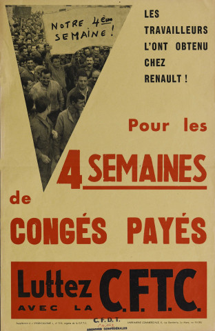 [une photographie d'ouvriers Renault manifestant] / [non identifié]. - Paris : CFTC, janvier 1963 (Le Mans : Imprimerie spéciale de "Syndicalisme", 6 rue Gambetta). - 1 affiche couleur. Date d'après l'annotation manuscrite au crayon à papier au verso.